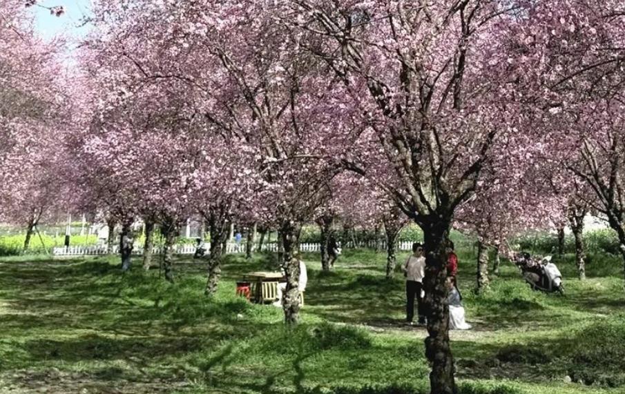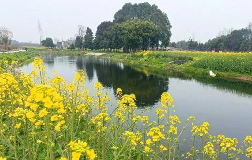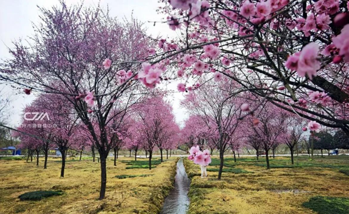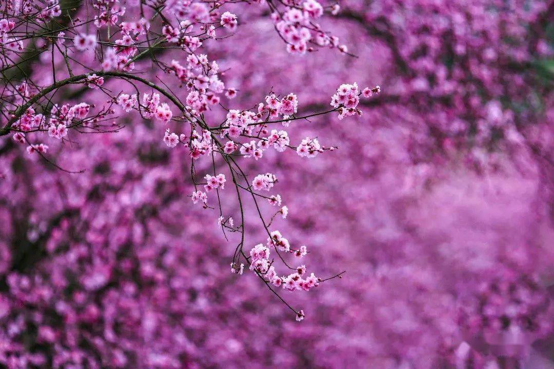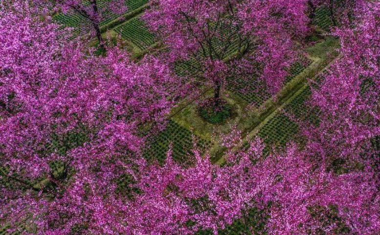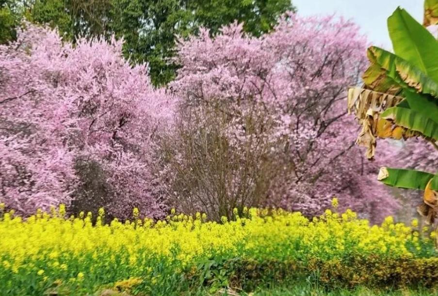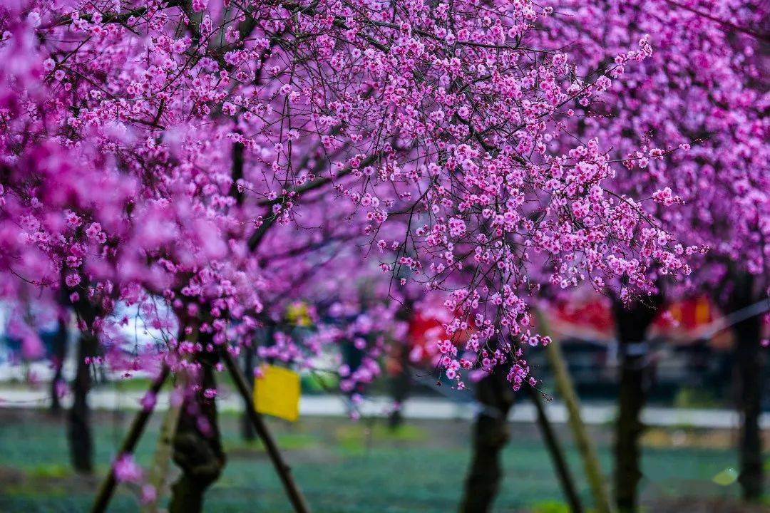 这里美人梅次第绽放,穿过一个个乡村林盘,在曲折的田间小路尽头,一片夺目的色彩映入眼帘。