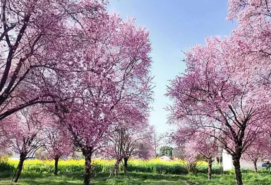 树下是绿绿的草地,加上远处嫩黄的油菜花,两相映衬,更显春意盎然。